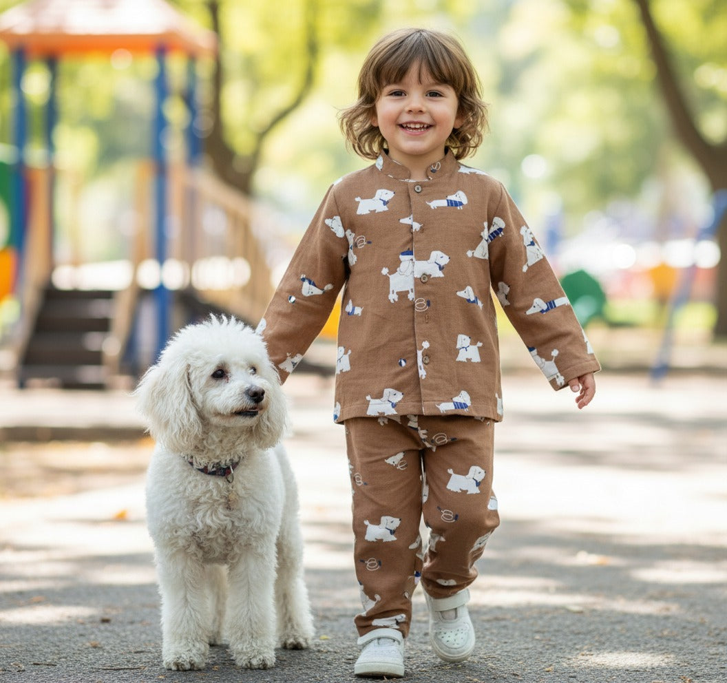 Looks mesmerizing holding that cute puppy wearing The Muslin Shop lounger from ‘The Puppy Collection’.