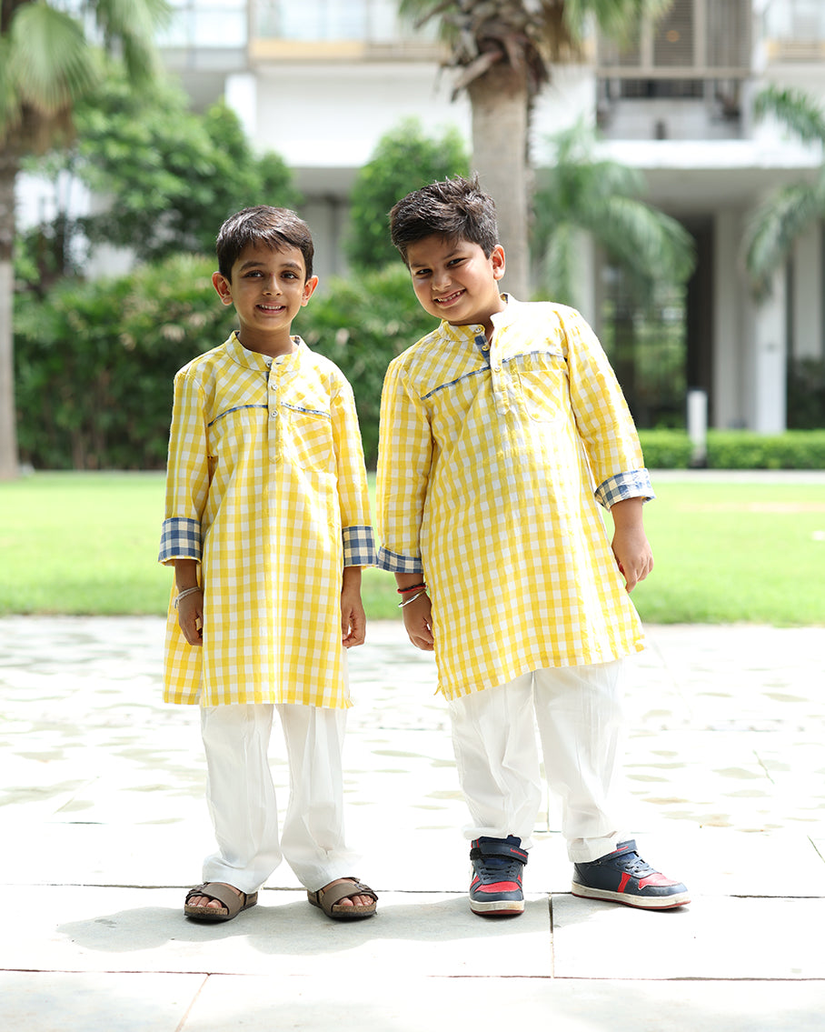 Bright yellow checks bring playful energy to this Indo-Western kurta pyjama set.