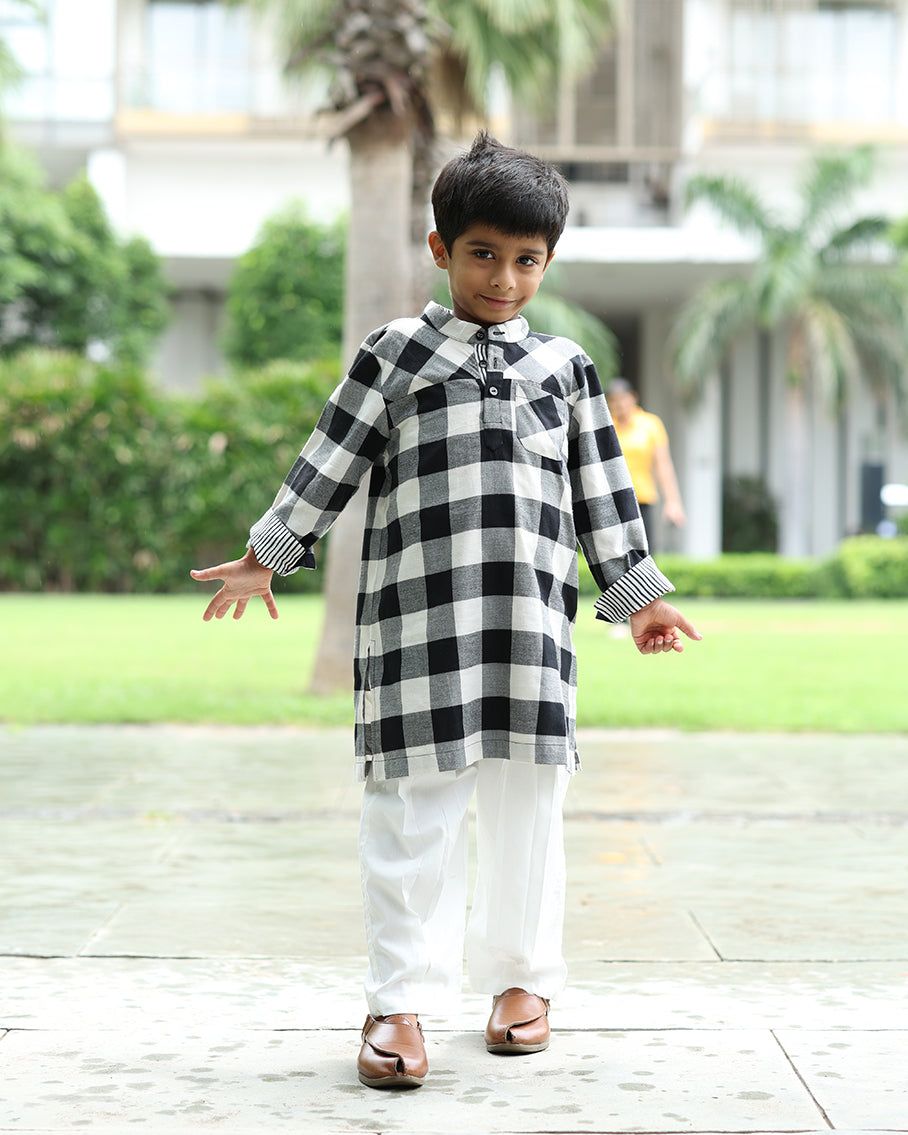Monochrome checks meet timeless charm in this Indo-Western kurta pyjama set.