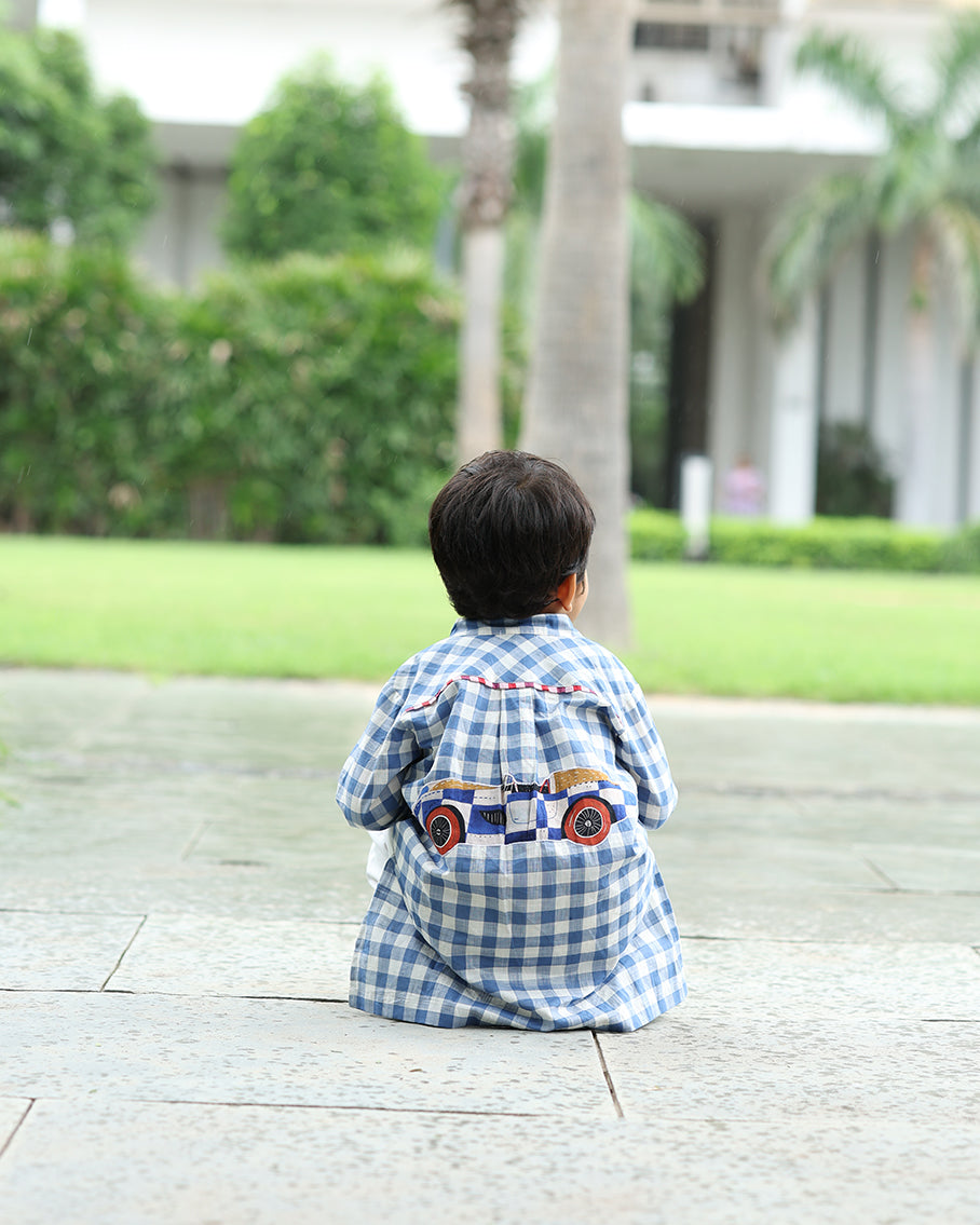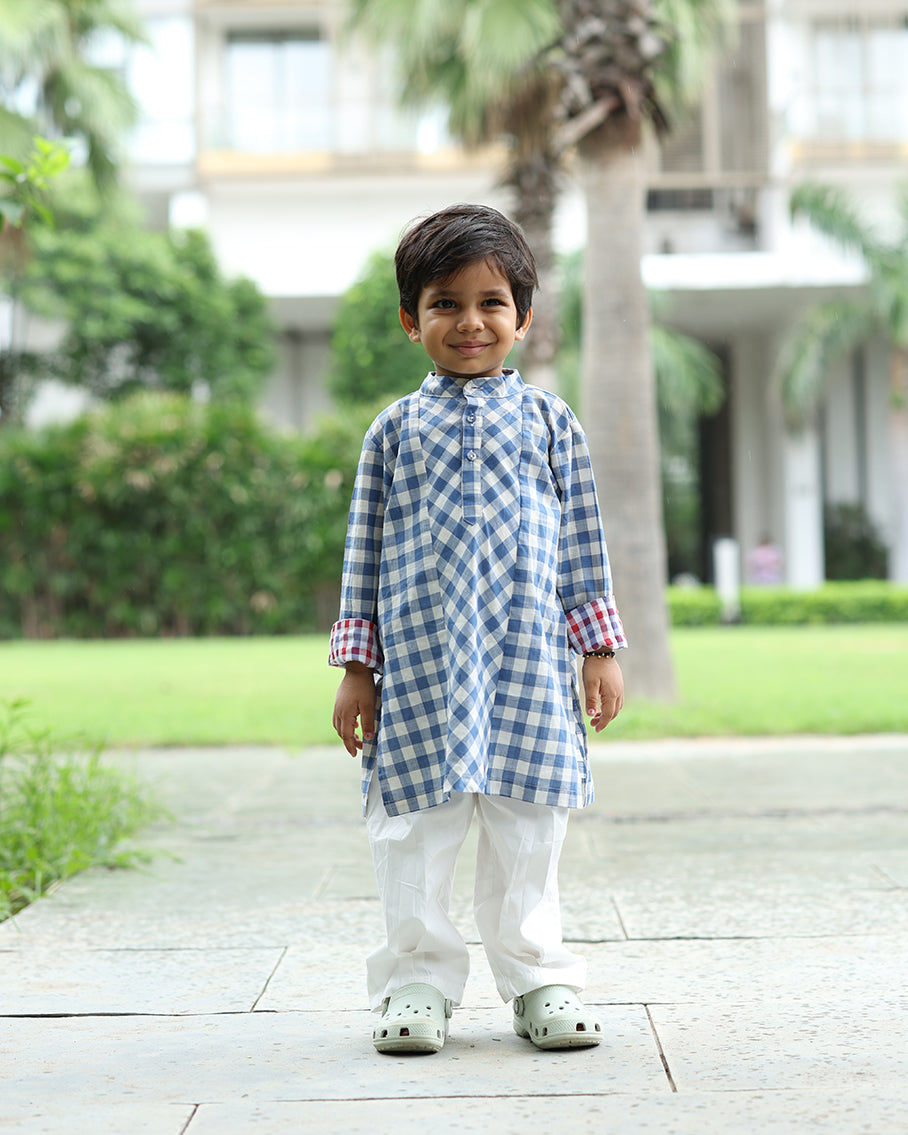 A classic blue checks Indo-Western kurta pyjama set for boys on the go.
