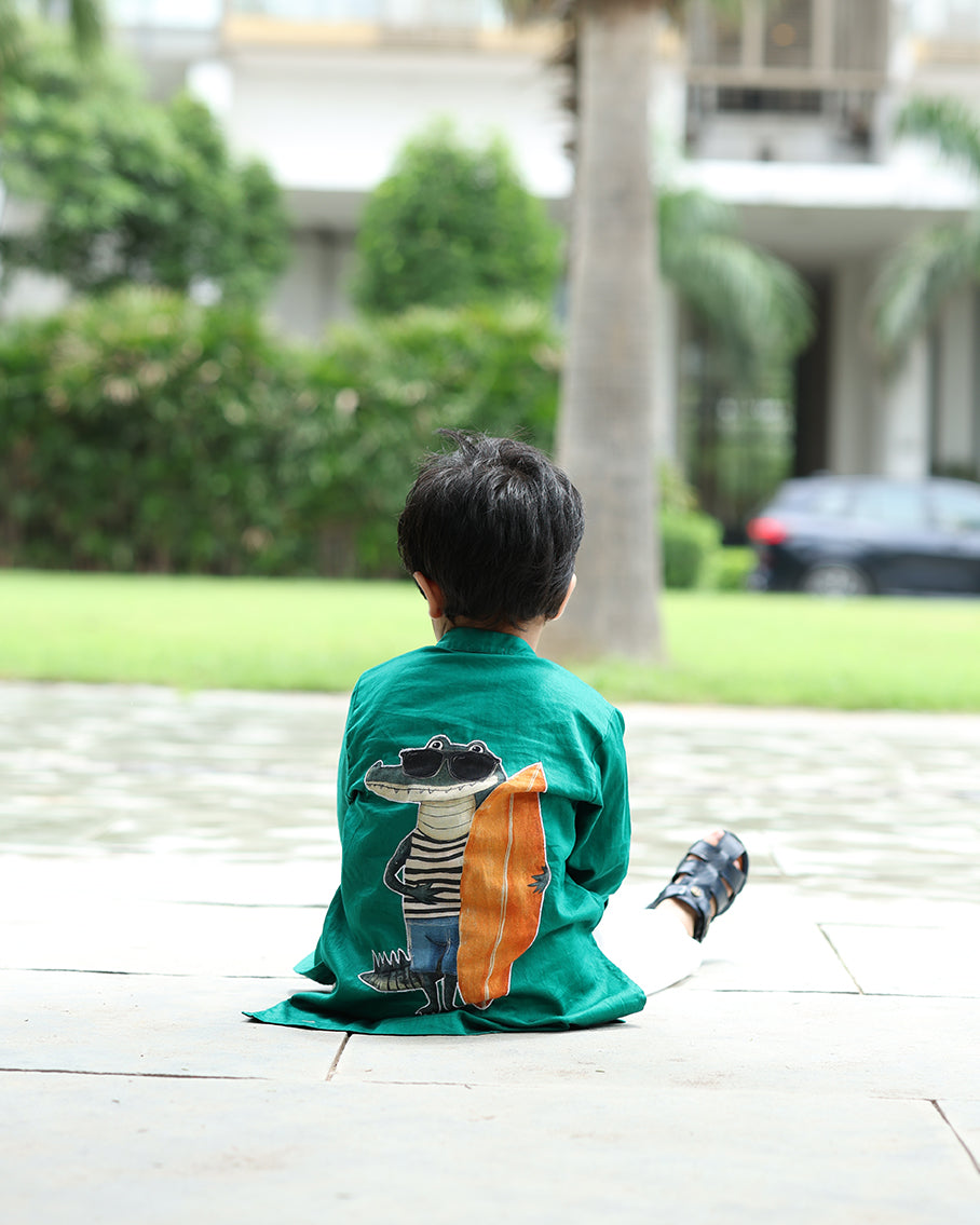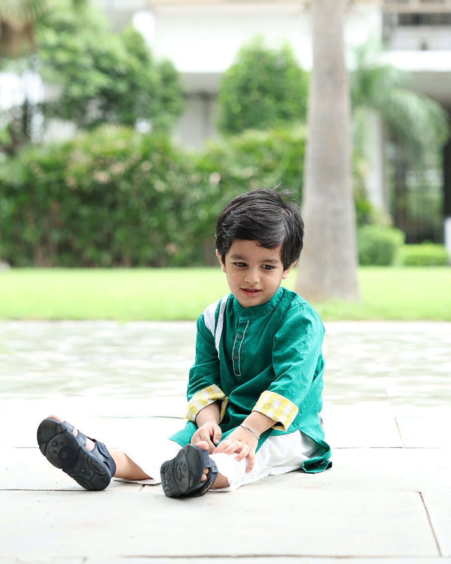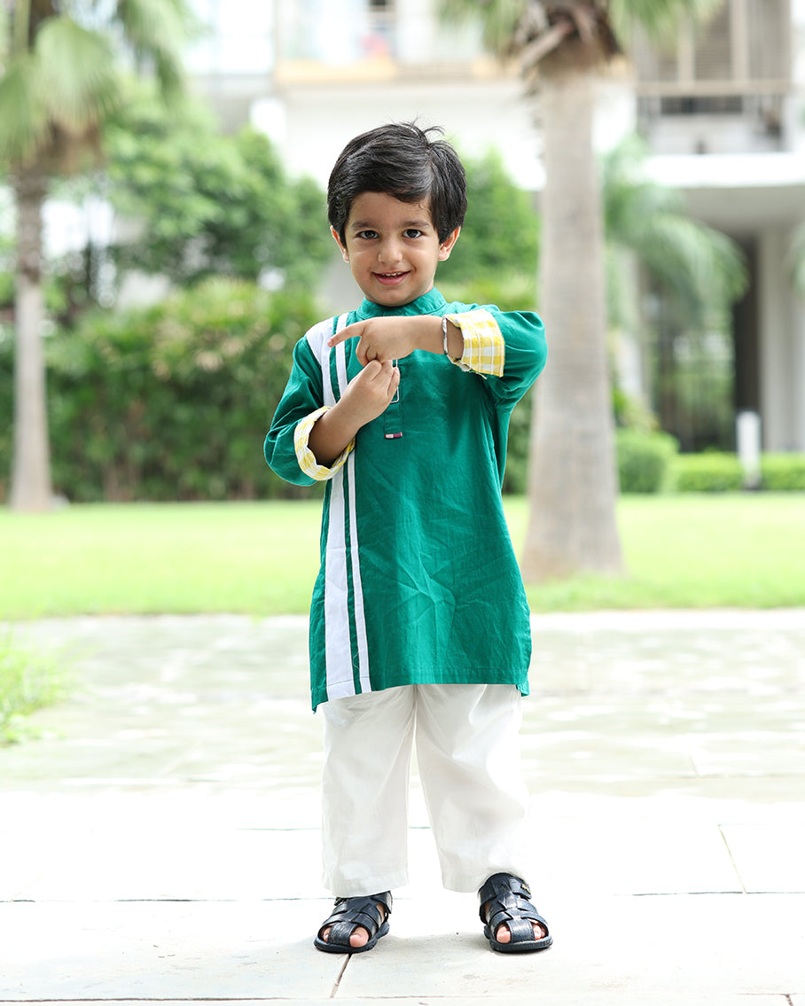 Vibrant green makes this Indo-Western kurta pyjama set fresh and fun.