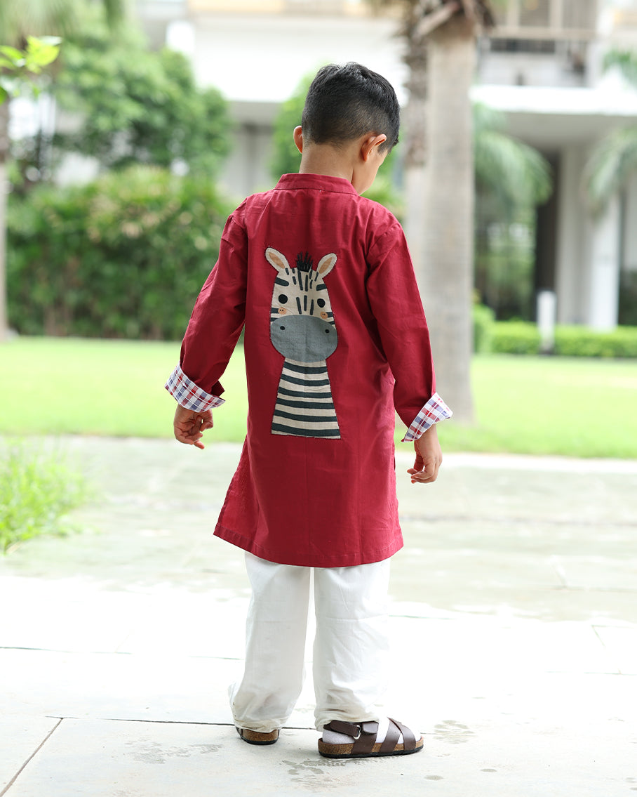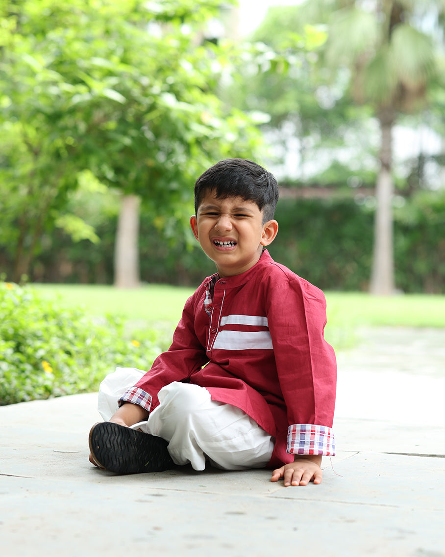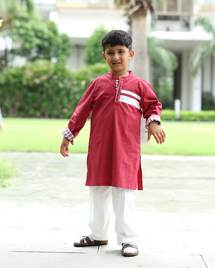 Bold red with a striking cut makes this Indo-Western kurta pyjama set a standout.